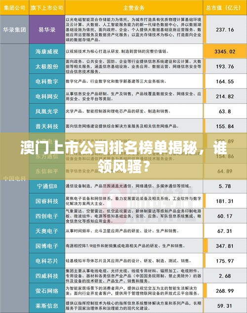 在众多的澳门上市公司中,有一些公司凭借其出色的业绩和强大的实力脱颖而出,成为了澳门上市公司的佼佼者,以下是澳门上市公司排名中的部分代表: